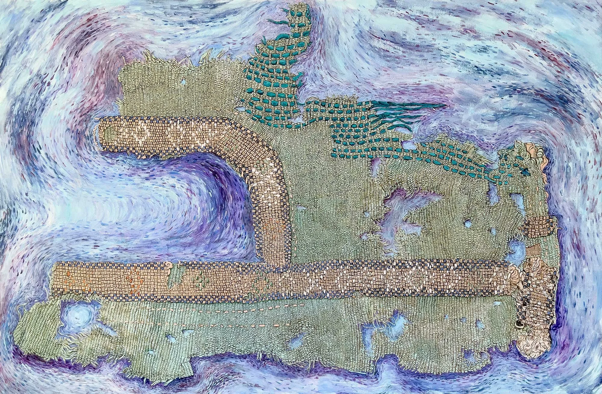 Each painted thread must be invented and spun, each painted fabric must be simultaneously structured and then pulled apart. By magnifying the scale and taking up multiple perspectives, I invite the viewer to take a journey across expanses that are simultaneously minute and vast. I honor the long life of the artifact, its ever-changing three-dimensional sculptural presence. My work invokes the digital coordinates of warp meeting weft, the matrix of yarn. And yet it also draws our attention to the insubordinate nature of this woven fragment, rebelling after centuries of wear.