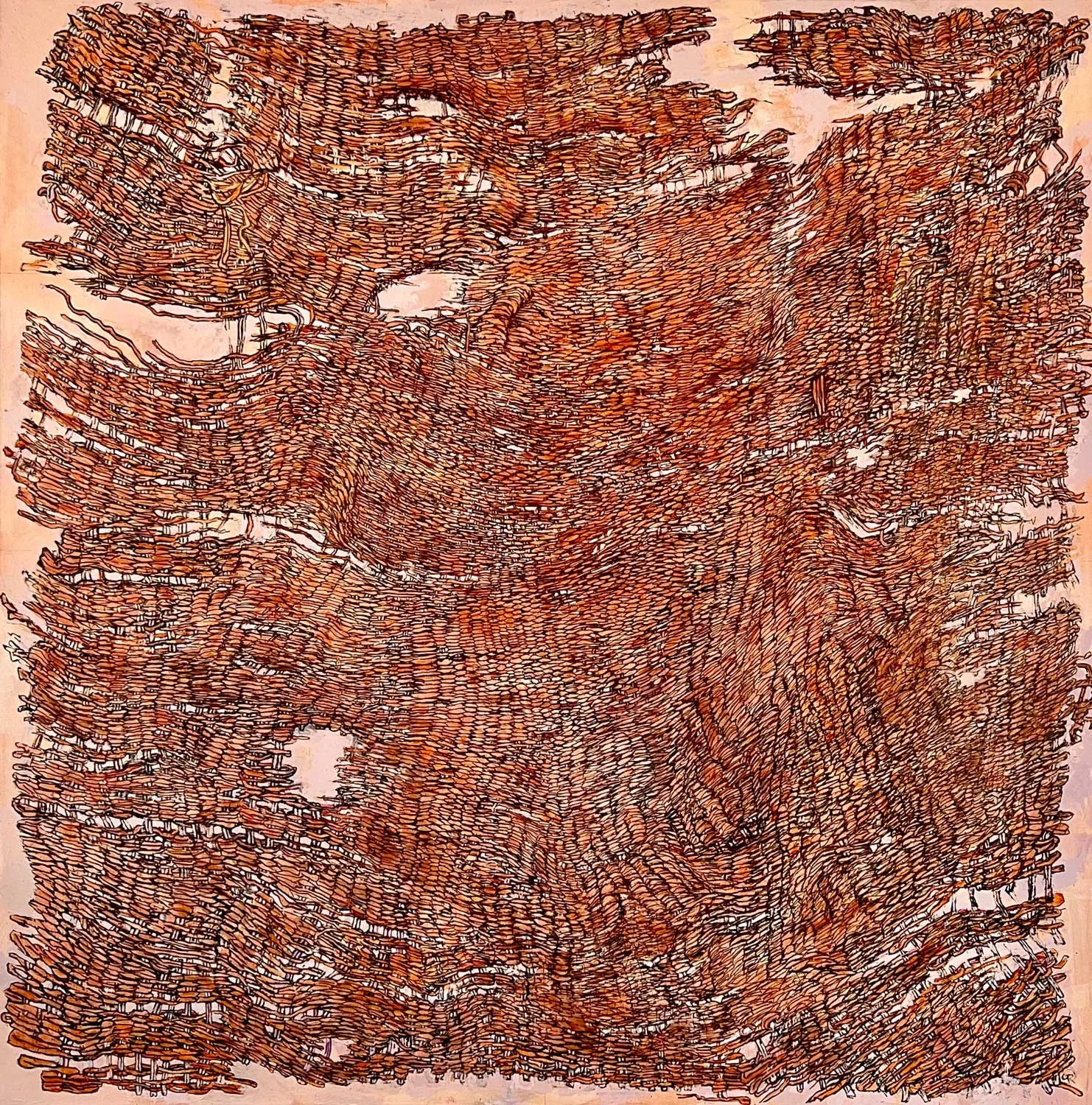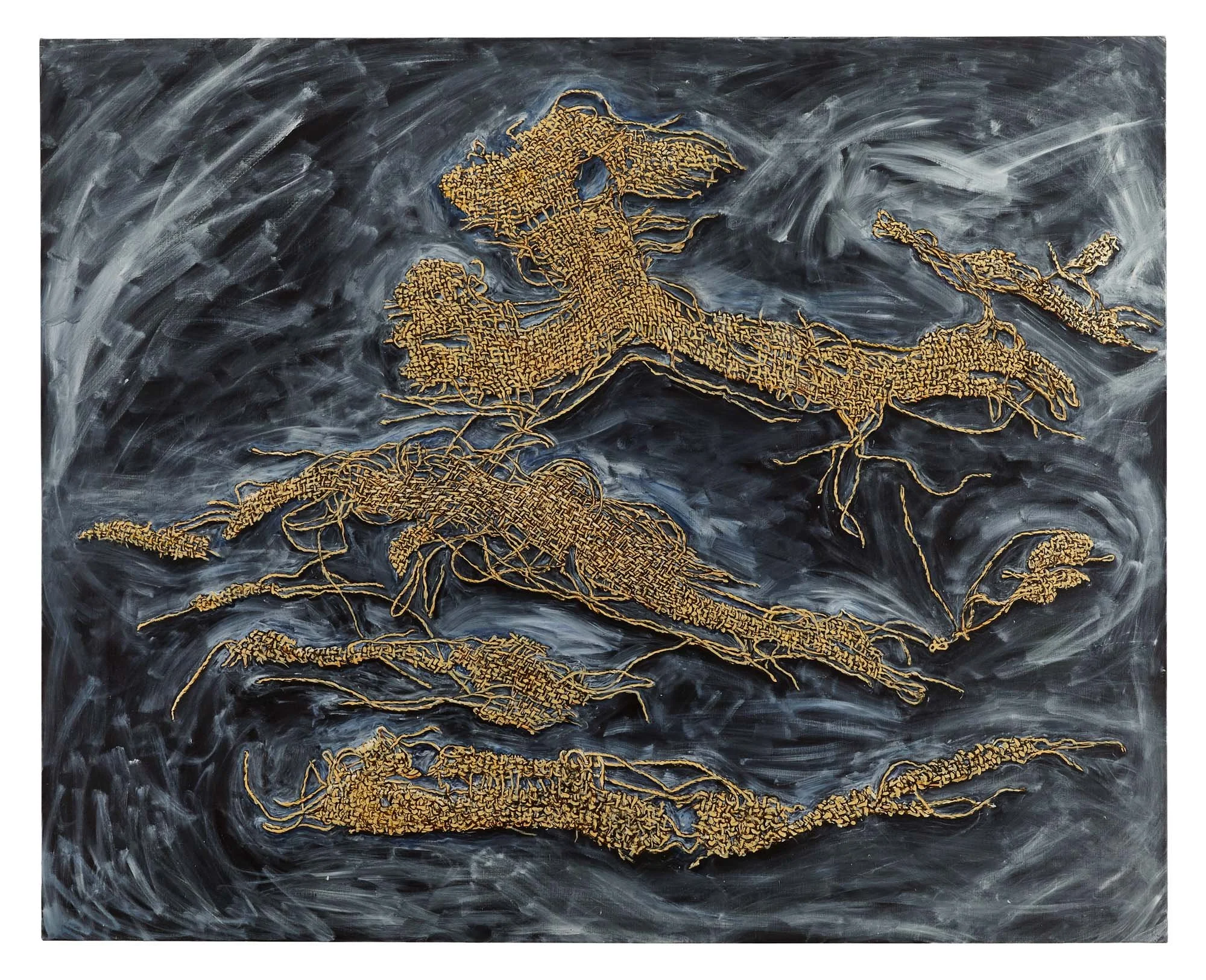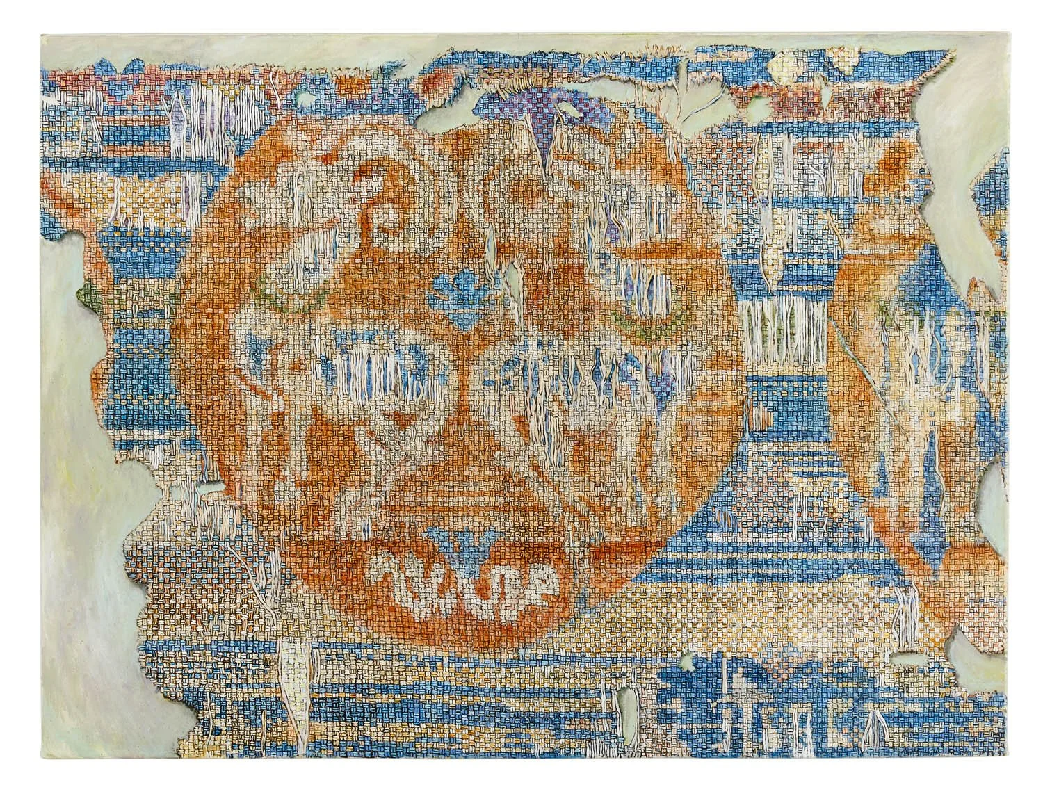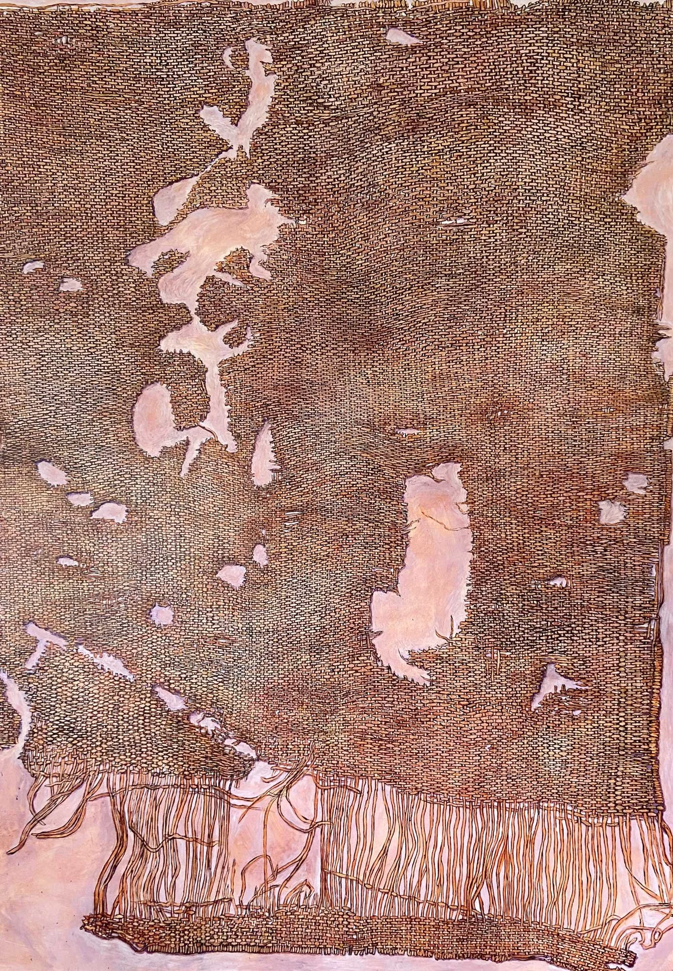 Re-presented as a monumental abstraction, each mark of paint both makes and unmakes an image of fabric. Over millennia the architectural grid of cloth returns to its biological origins, what looks like a coastline decays and transforms with time. This painting is testament to the paradox—what is interwoven will ultimately unravel, and that which grows will inevitably decay.